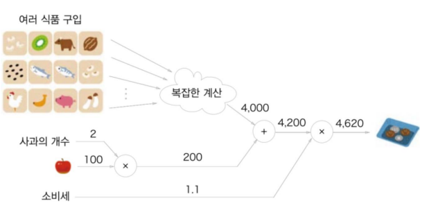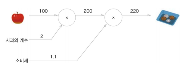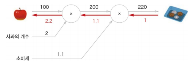 이때 사과가 1원 오르면 전체 가격은 얼마나 오를지 볼 수 있는 것이 역전파: Backpropagation