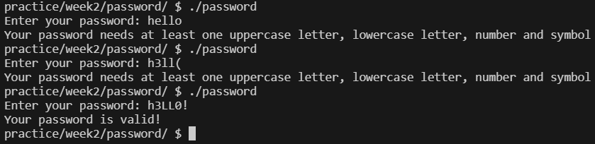 이 실습에서는 사용자에게 비밀번호를 묻는 메시지가 표시되며, 비밀번호는 개발자가 완료하게 될 기능 검사를 통해 검증됩니다. 비밀번호에 하나 이상의 대문자, 하나의 소문자, 숫자 및 기호('!', '$' 및 '#'과 같이 문자나 숫자가 아닌 인쇄 가능한 문자를 의미함)가 포함된 경우 함수는 true를 반환해야 합니다. 그렇지 않은 경우 false를 반환해야 합니다.