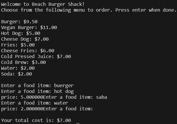 printf("\nWelcome to Beach Burger Shack!\n");