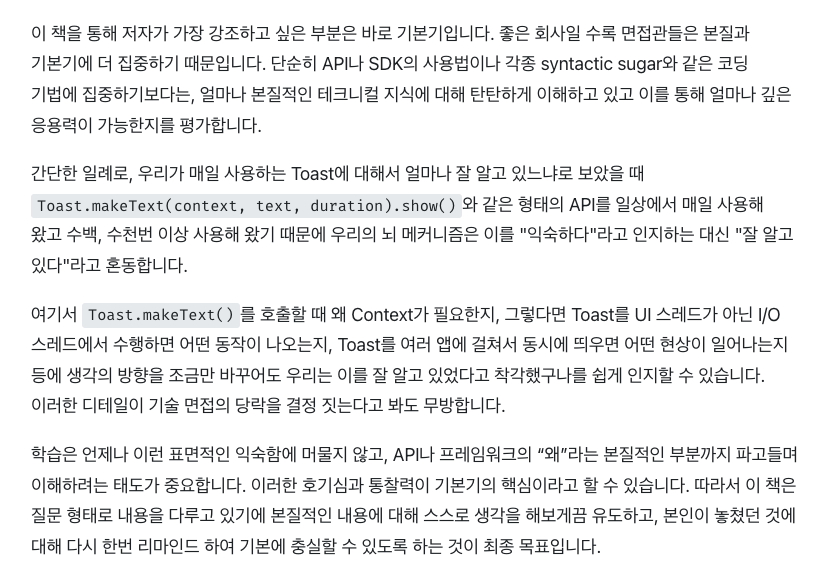 Toast.makeText()를 호출할 때 왜 Context가 필요한지, 그렇다면 Toast를 UI 스레드가 아닌 I/O 스레드에서 수행하면 어떤 동작이 나오는지, Toast를 여러 앱에 걸쳐서 동시에 띄우면 어떤 현상이 일어나는지 등에 생각의 방향을 조금만 바꾸어도 우리는 이를 잘 알고 있었다고 착각했구나를 쉽게 인지할 수 있습니다. 이러한 디테일이 기술 면접의 당락을 결정 짓는다고 봐도 무방합니다."