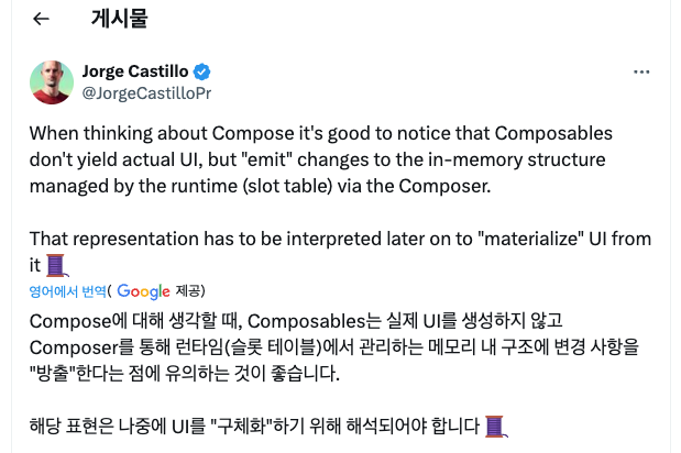 Composer를 통해 Compose Runtime이 관리하는 메모리 내 구조(slot table)에 변경사항을 '방출(emit)' 한다.