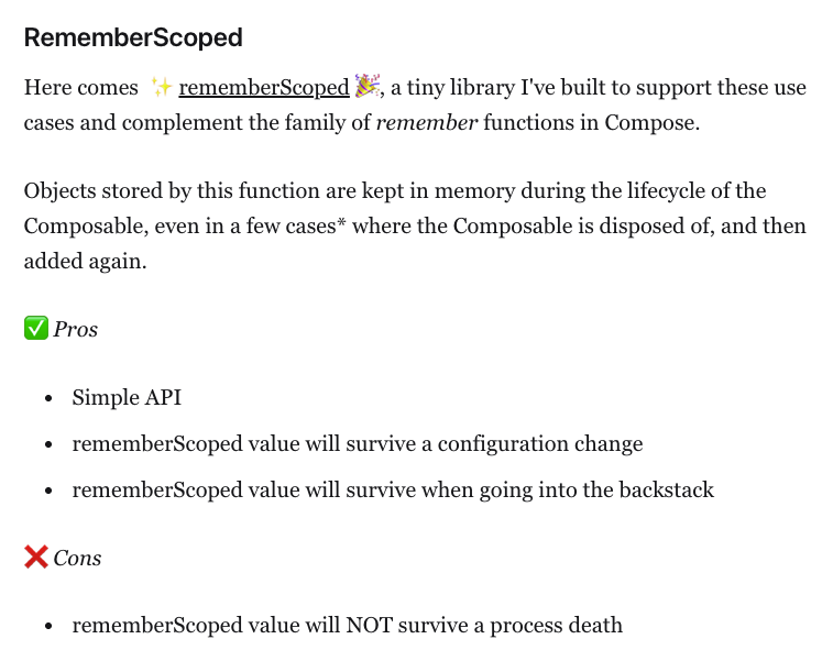 실제로 이 Resaca 라는 라이브러리는 Circuit의 정식 릴리즈보다 대략 11개월 정도 이른 2021년 12월에 처음 릴리즈 되었으며, remember/rememberSaveable 의 한계점을 인식하고 RememeberScoped 라는 API를 이미 지원하였다.