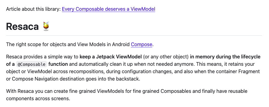 내부적으로(암시적으로) ViewModel을 사용하는 Circuit, Rin과는 다르게 Resaca를 적용할 경우엔 명시적으로 ViewModel을 사용하는 것을 확인할 수 있었다. 각 라이브러리의 철학이 상이함을 어림 짐작할 수 있는 부분