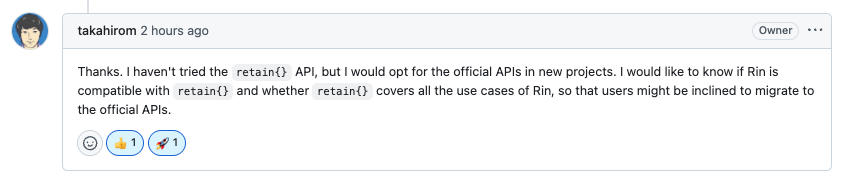 Rin 라이브러리 깃허브에 앞으로의 향후 방향성 관련 질문을 이슈에 남겨두었고, 답변을 받을 수 있었다.