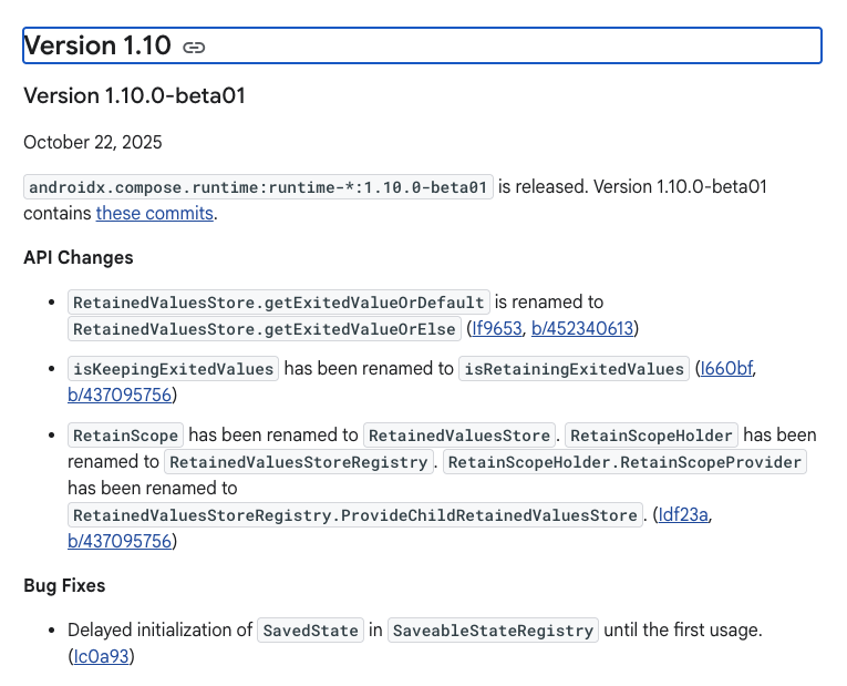 결론적으로, Compose가 세상에 등장한지 얼마되지 않은 시점부터, Composition 에서 제거된 상황으로 부터 기존의 상태를 유지하려는 니즈는 꾸준히 있어왔고, 그에 따라 여러 라이브러리들이 개발되었으며, 현 시점에선 이를 Compose 에서 공식으로 지원하게 되었다고 보면 될듯하다.
