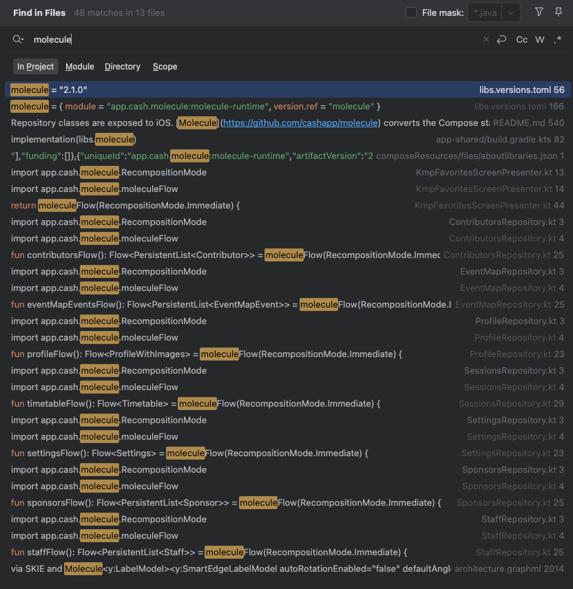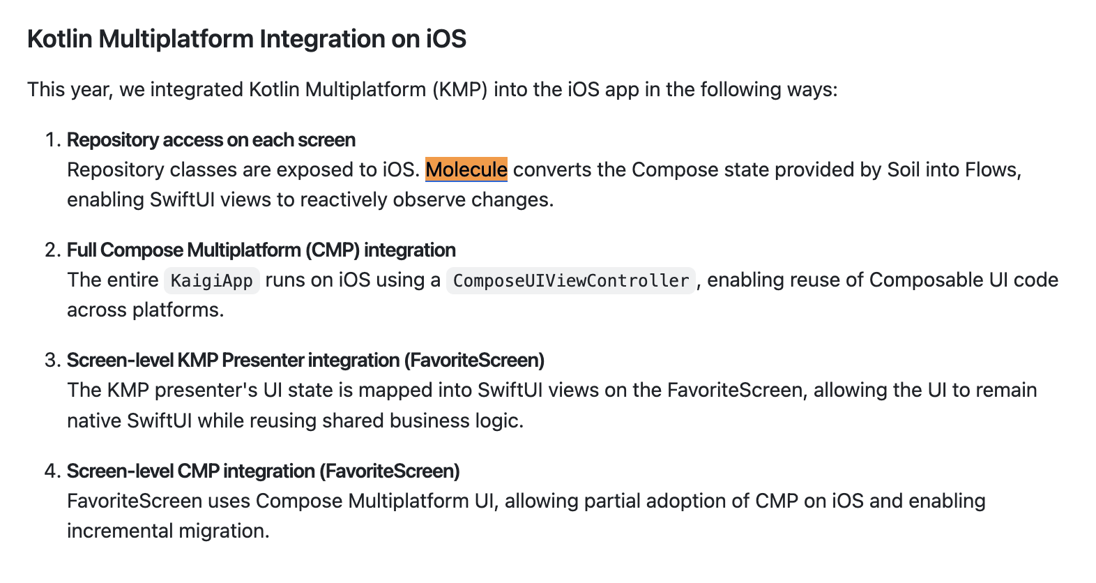 또한 Cash App의 molecule 라이브러리도 Soil과 함께 사용하는 것을 확인할 수 있었는데, 리드미를 확인해보니 soil이 제공하는 Compose State를 flow로 변환하는데에 molecule을 사용하구, iOS SwiftUI에서 이 flow를 구독해서 상태 변화에 따라 UI가 자동으로 업데이트되도록 사용한다고 한다.