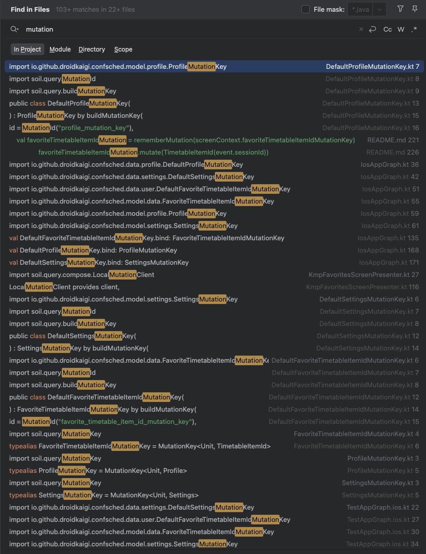 DroidKaigi에서도 역시 서버 API 호출 상황이 아닌, 로컬 DB에 접근하여 데이터를 변경하는 작업에서 Mutation을 사용하는 것을 확인 할 수 있었다. 로컬 DB에 접근하는 경우에도 로딩, 실패 상황이 존재하지 않는 것은 아니기 때문에, Mutation 을 사용하는 적절한 UseCase 임엔 틀림 없다.