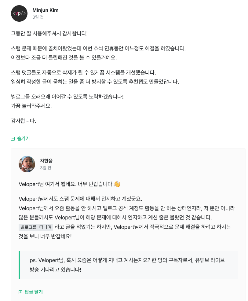 해당 글에 댓글에 Velopert님께서 직접 등판하셔서 AI 관련 스팸글이 자동으로 삭제될수 있게끔 시스템을 개선하였다고 말씀 하셨다.
