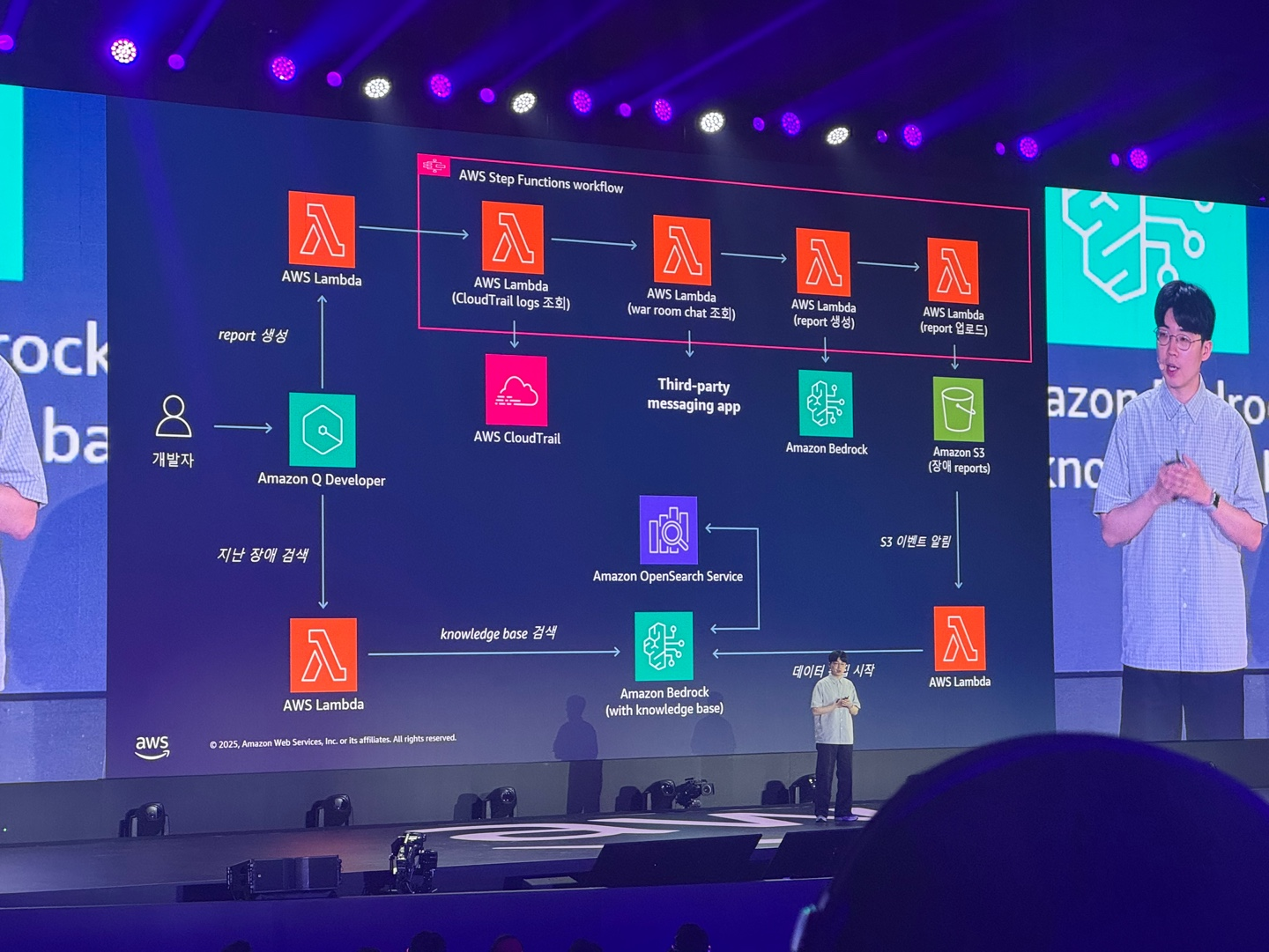 특히 Amazon Q Developer, Amazon Bedrock이 세션마다 꼭 언급이 되고 있었는데, 회사 도메인 특성 상 생성형 AI를 비즈니스 로직에 녹이기는 어렵겠지만 DevOps 환경에서 생성형 AI를 사용하는 부분은 굳이 AWS 종속적인 서비스가 아니더라도 한 번 도입을 해보는 것도 나쁘지 않겠다는 생각이 들었다.