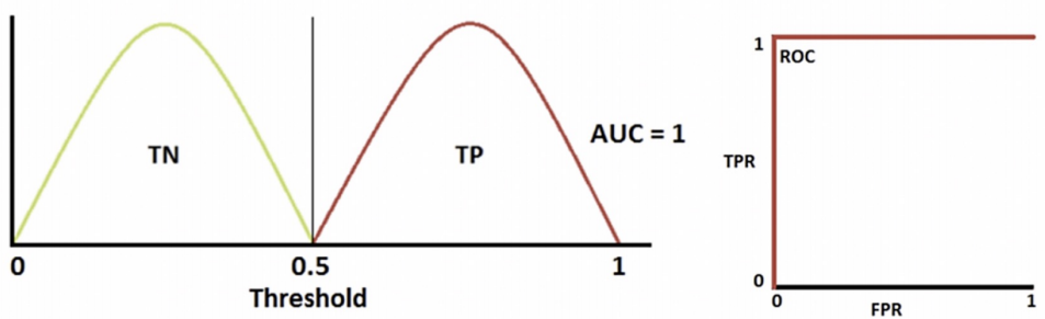 - 완벽한 모델 (AUC는 ROC Curve 아래의 면적 → 1에 가까울수록 좋음. 직선인 경우인 0.5보다 커야함.)