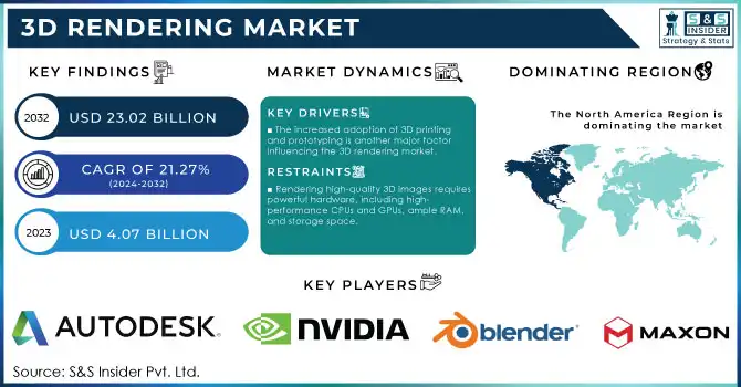 The 3D Rendering Market was valued at USD 4.07 billion in 2023 and is expected to reach USD 23.02 billion by 2032, growing at a CAGR of 21.27% over the forecast period 2024-2032.
