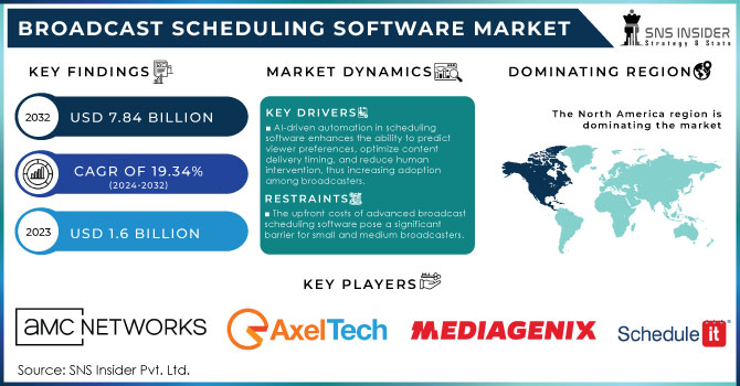 The Broadcast Scheduling Software Market Size was valued at USD 1.6 Billion in 2023 and is expected to reach USD 7.84 Billion by 2032, growing at a CAGR of 19.34% over the forecast period 2024-2032.
