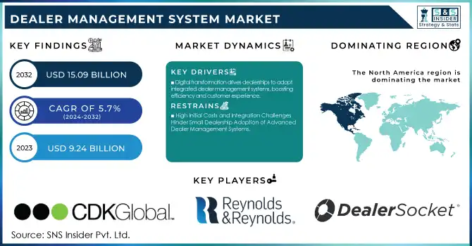 The Dealer Management System Market Size was valued at USD 9.24 Billion in 2023 and is expected to reach USD 15.09 Billion by 2032 and grow at a CAGR of 5.7% over the forecast period 2024-2032.