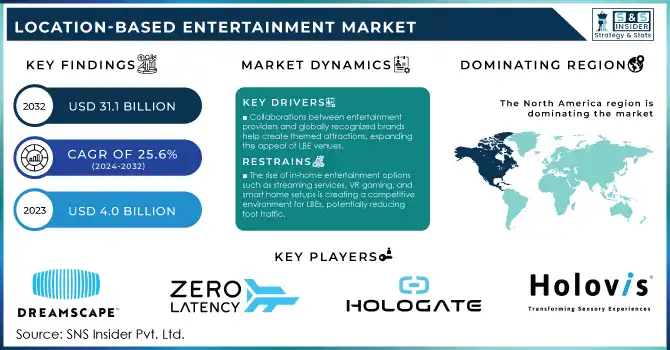 The Location-Based Entertainment Market Size was valued at USD 4.0 Billion in 2023 and is expected to reach USD 31.1 Billion by 2032, growing at a CAGR of 25.6 % over the forecast period 2024-2032.