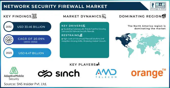 The Network Security Firewall Market was valued at USD 6.47 billion in 2023 and is expected to reach USD 33.46 billion by 2032, growing at a CAGR of 20.09% from 2024-2032