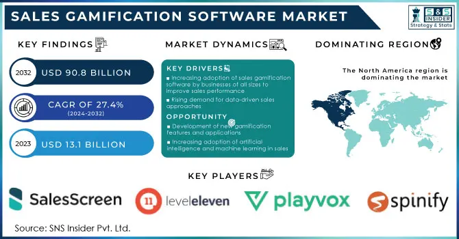 The Sales Gamification Software Market size was valued at USD 13.1 Billion in 2023. It is expected to grow to USD 90.8 Billion by 2032 and grow at a CAGR of 27.4% over the forecast period of 2024-2032.