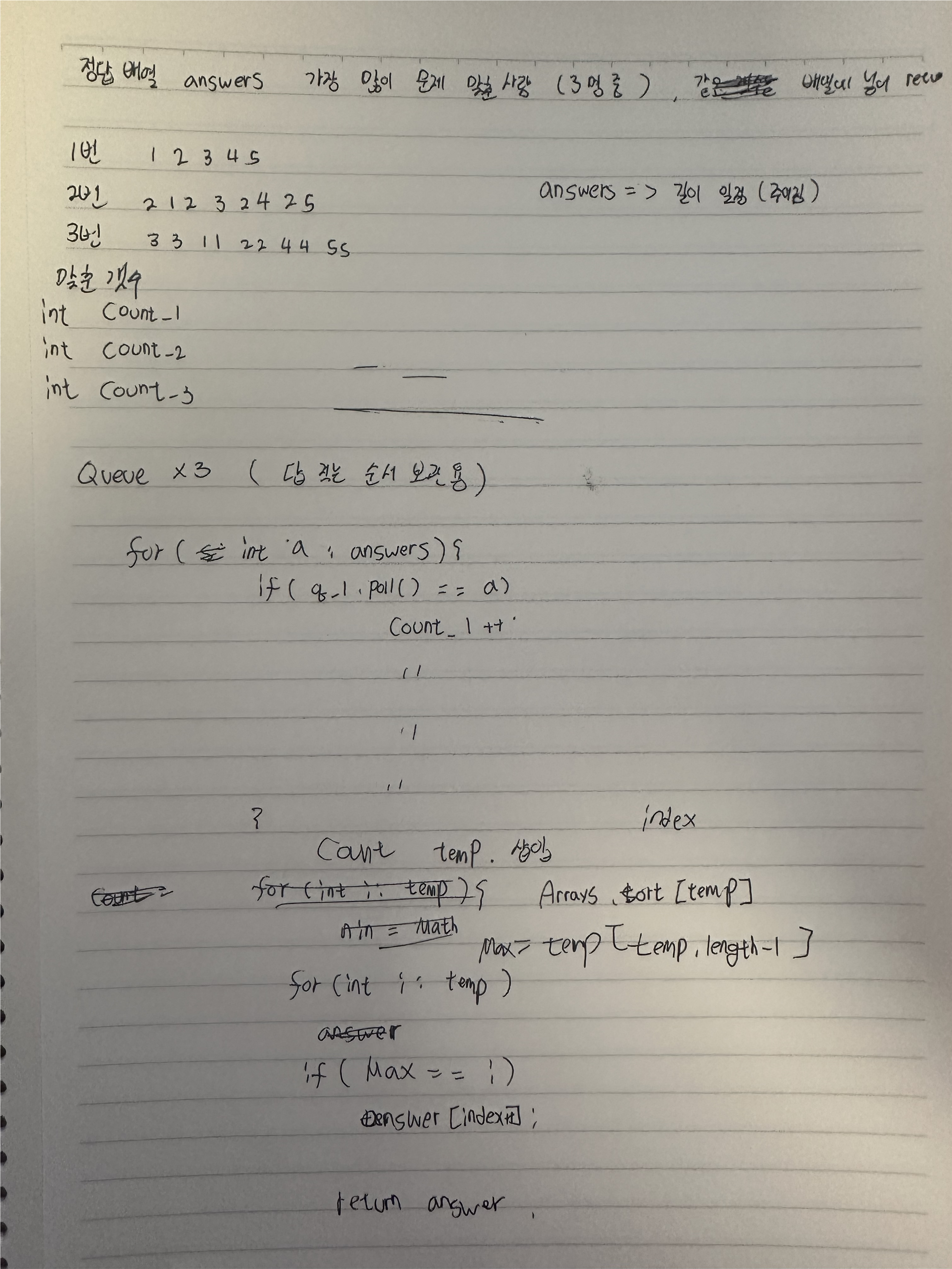 모의고사 수학 문제 정답으로 주어지는 배열 answers가 있을 때, 가장 많이 맞춘 수포자(or 수포자들)을 배열에 넣어 return 하라.