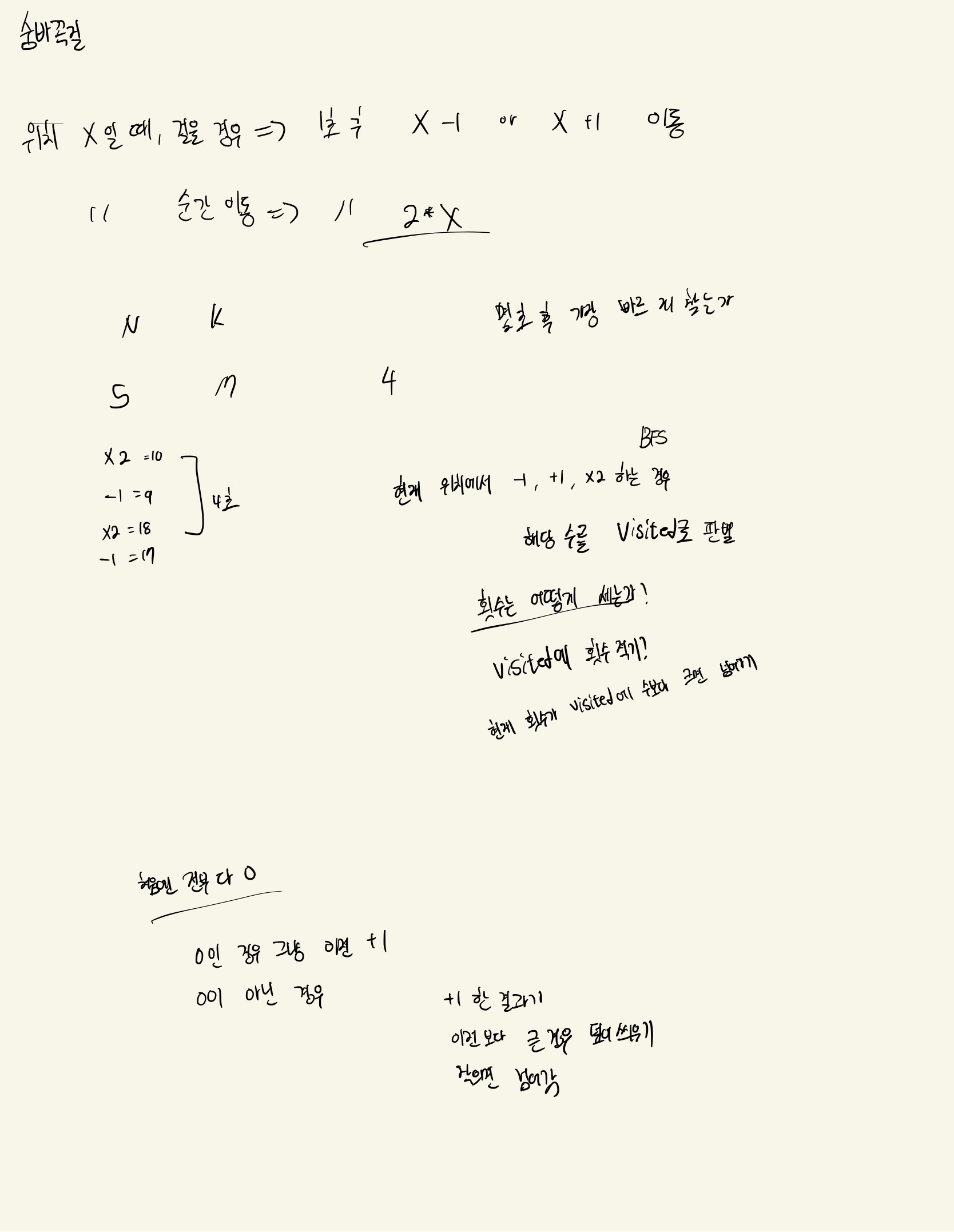 만약 visited[cur]의 값이 visited[cur-1] 등등의 값보다 클 수도 있을까라는 의문을 가진 채로 풀었다. 하지만, 이는 틀린 가정이였다. bfs에서 이미 방문한 경우, 횟수가 현재보다 더 적은 경우 밖에 없다는 것을 알았다.