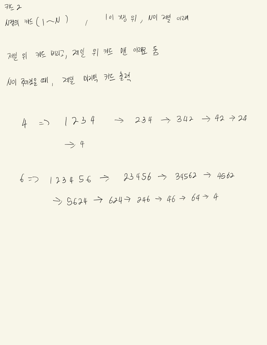 이 때, 다음1,2번 같은 과정을 반복하여 카드가 1장이 남을 때까지 제거한다.