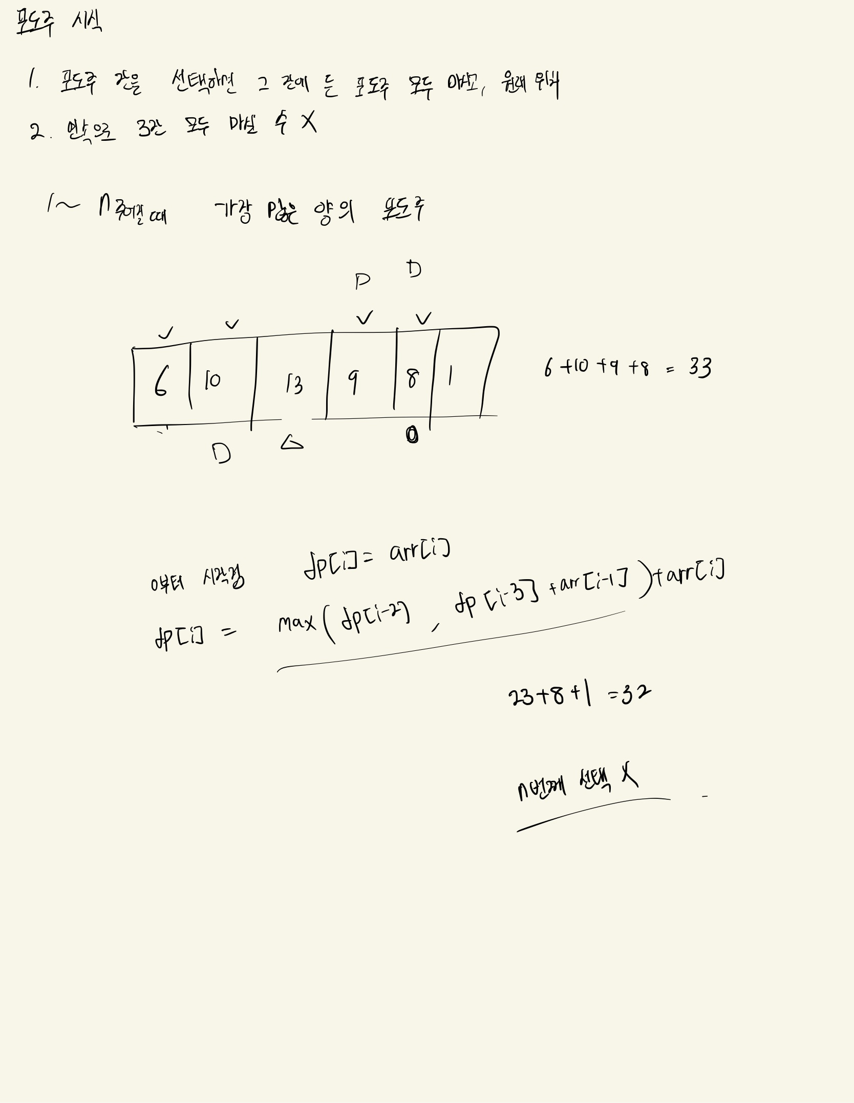 연속으로 놓여있는 포도주 3잔을 마시지만 않으면 되므로, 2칸 전과 3칸 전 + 1칸 전의 용량 + 현재 칸의 용량 을 비교하고, 이전 칸에 마신 포도주 용량과 비교한다.