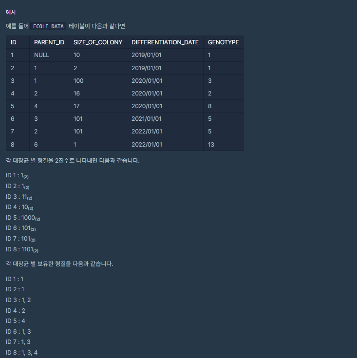 ECOLI_DATA 테이블을 하나는 자식 테이블인 so, 하나는 부모 테이블인 pa를 잡아서 so.PARENT_ID = pa.ID 을 기준으로 두 테이블을 join 한다.
