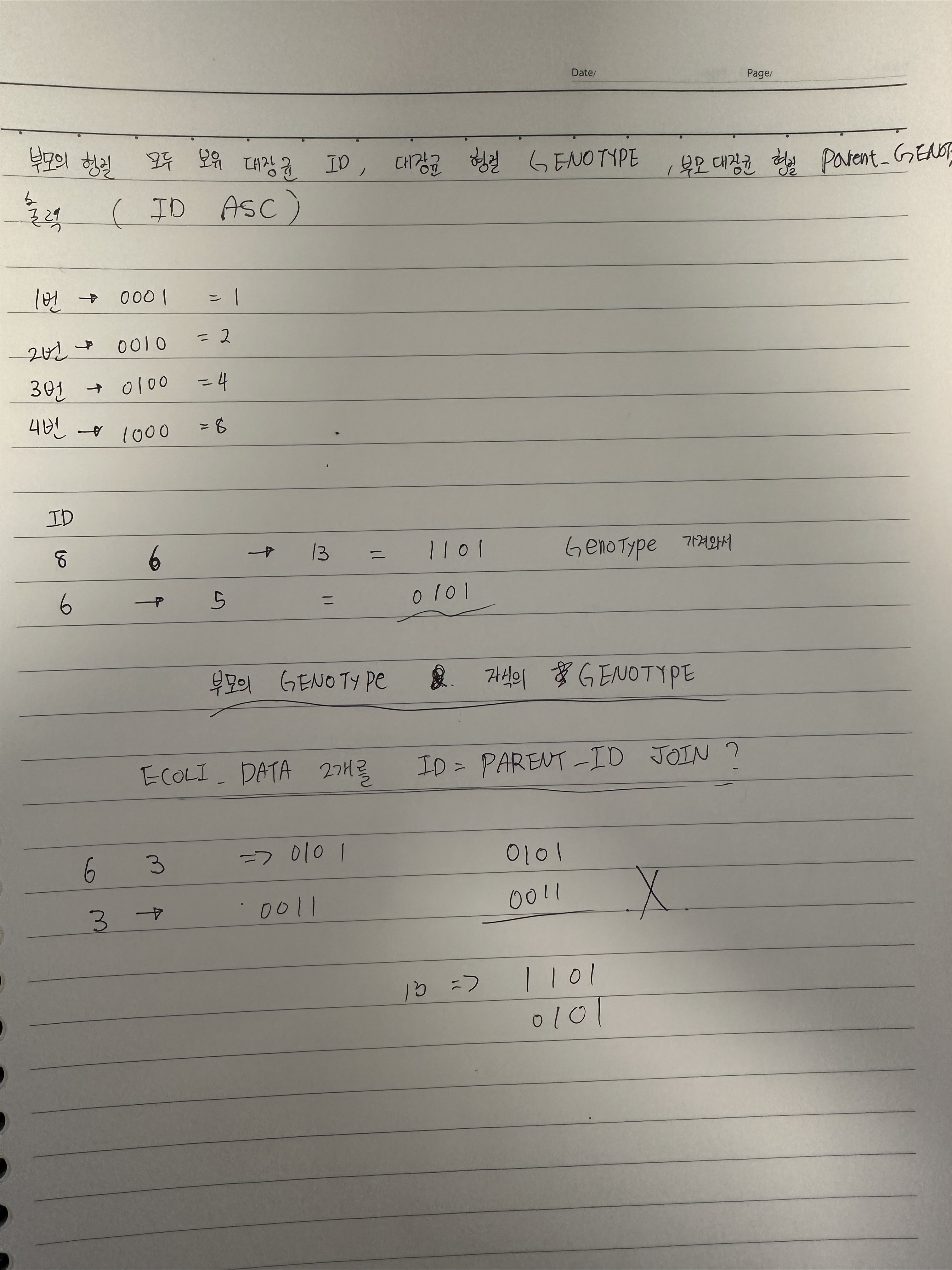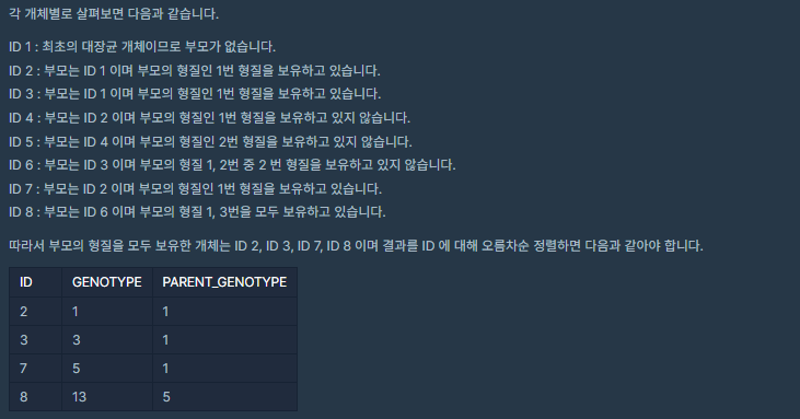 처음 풀었을 때, 같은 테이블을 부모, 자식의 ID 기준으로 join은 시키고, 부모 GENOTYPE 와 자식 GENOTYPE를 & 연산 까지 했다.