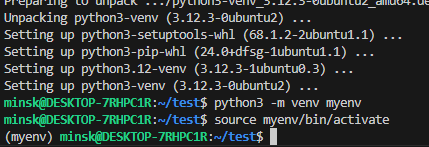 python3 -m venv myenv # 현재 위치에 'myenv'라는 디렉터리가 생성되며, 그 안에 가상환경이 구성.