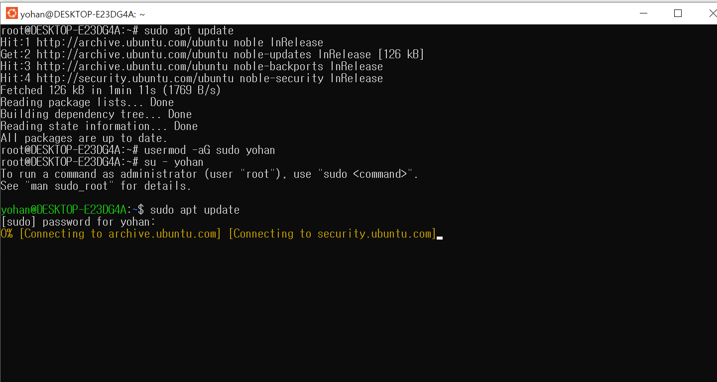 usermod -aG sudo {USER_NAME} # USER에 권한주기