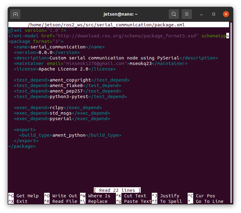 sudo nano ~/ros2_ws/src/serial_communication/package.xml
