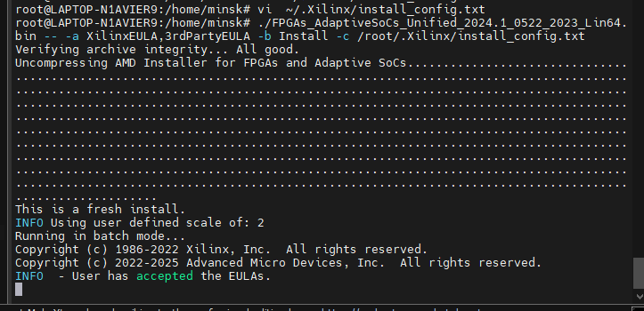 ./FPGAs_AdaptiveSoCs_Unified_2024.1_0522_2023_Lin64.bin -- -a XilinxEULA,3rdPartyEULA -b Install -c /root/.Xilinx/install_config.txt