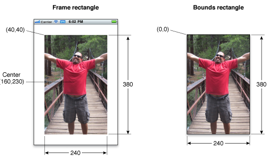 You use the bounds 주로 drawing에 사용한다. 뷰의 로컬 좌표시스템을 나타내는데 사용된다. origin은 (0, 0)이고 프레임 사각형의 크기와 일치한다. bounds 사각형의 origin을 바꾸더라도 새로운 사각형 안에 그리는 것은 뷰의 보이는 콘텐츠가 된다.