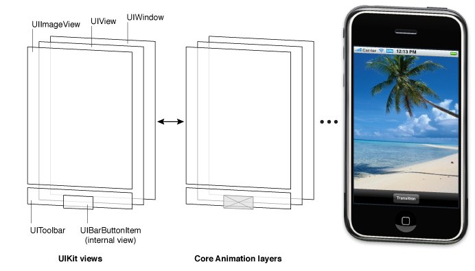 모든 뷰는 뷰의 레이어 속성을 통해 접근할 수 있다.(바버튼은 뷰가 아니기 때문이다.) 레이어 객체의 뒤에는 객체를 렌더링하는 Core Animation과 스크린의 실제 비트를 관리하는 하드웨어 버퍼가 있다.