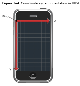 중요: 몇몇의 iOS 기술들은 기본 좌표 시스템의 원래 포인트와 방향을 UIKit와 다르게 정의한다. 예를 들어, Core Graphics and OpenGL ES은 lower-left corner에 origin이 있고, y축의 포인트가 위쪽으로 올라가는 방향의 좌표 시스템을 사용한다.