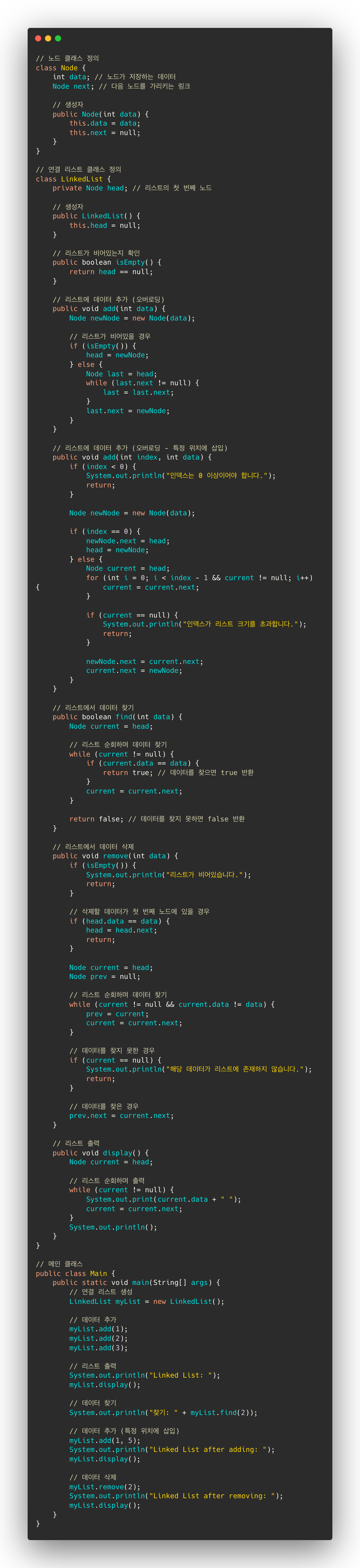 링크드 리스트는 데이터를 노드로 구성하고 각 노드가 다음 노드를 가리키는 방식으로 이루어진 자료 구조이다. 자바에서는 LinkedList 클래스가 이를 구현한다.