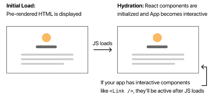 미리 생성한 HTML을 최초 로드 시 표시한다. 그래서 React에서 실행시키기 어려운 낮은 브라우저도 Next.js가 미리 생성한 HTML화면을 볼 수 있다.