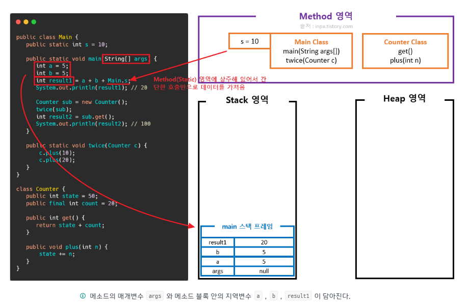 출처: https://inpa.tistory.com/entry/JAVA-%E2%98%95-%EA%B7%B8%EB%A6%BC%EC%9C%BC%EB%A1%9C-%EB%B3%B4%EB%8A%94-%EC%9E%90%EB%B0%94-%EC%BD%94%EB%93%9C%EC%9D%98-%EB%A9%94%EB%AA%A8%EB%A6%AC-%EC%98%81%EC%97%AD%EC%8A%A4%ED%83%9D-%ED%9E%99