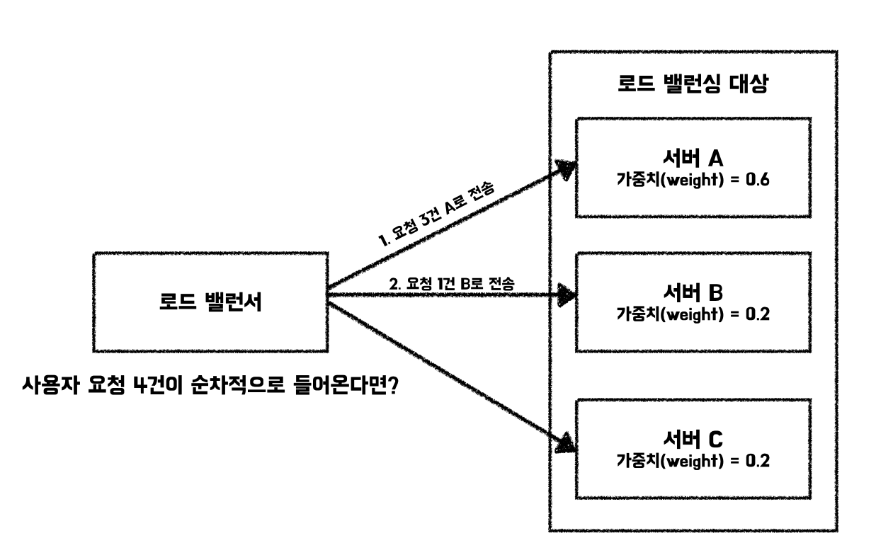 따라서 각 가중치를 두어서, 조금 더 많은 요청을 처리할 수 있는 서버에 높은 가중치를 두어서, 로드 밸런서에서 요청을 분배한다.