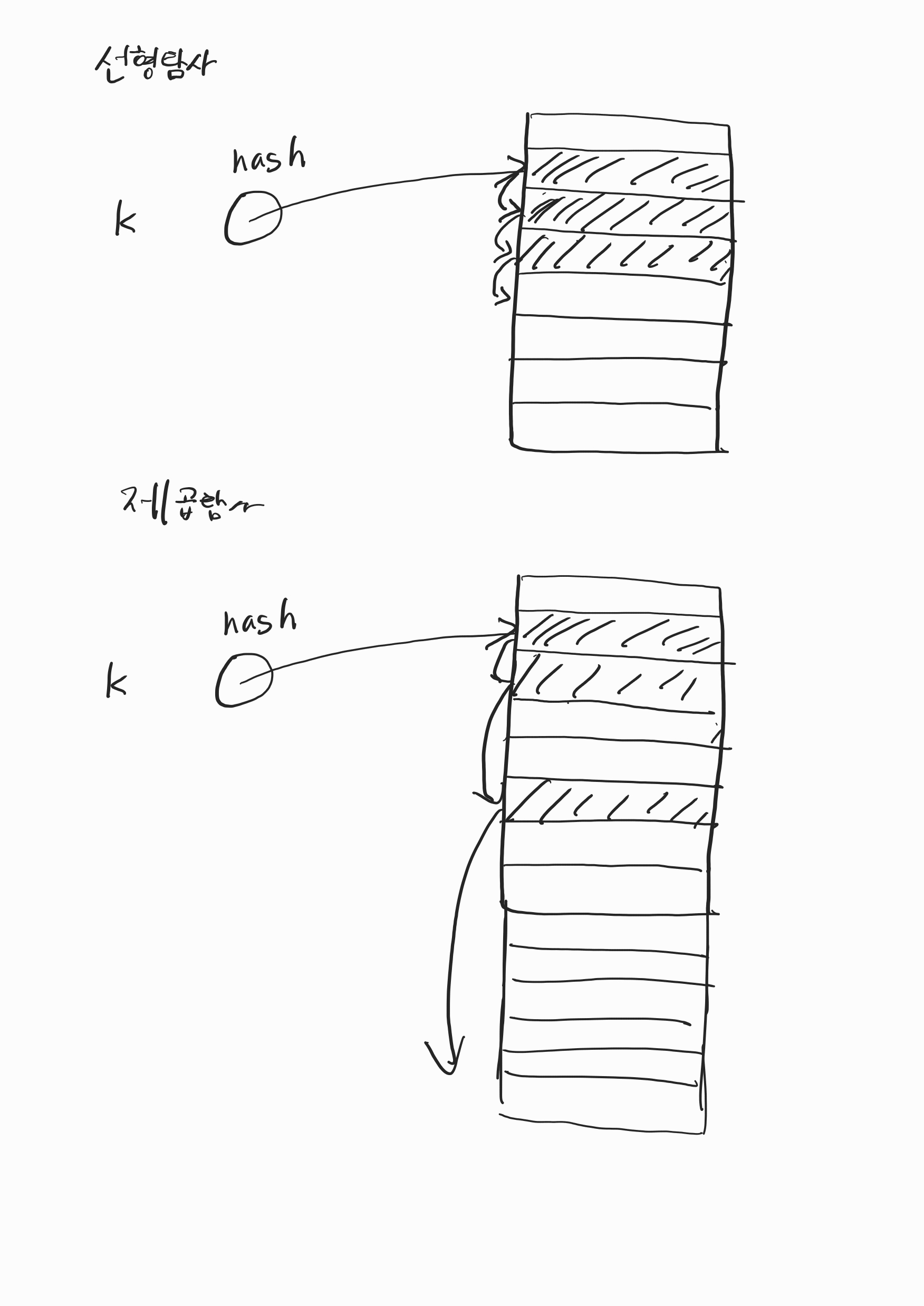 충돌이 일어날 때 고정된 크기 만큼 한번 옮겨서 빈 버킷을 찾는 것 이다. 빈 버킷을 못찾는다면, 즉 특정 버킷 주변에 모두 채워져있다면, 계속 탐사를 하므로 시간이 오래걸릴수 밖에 없다.