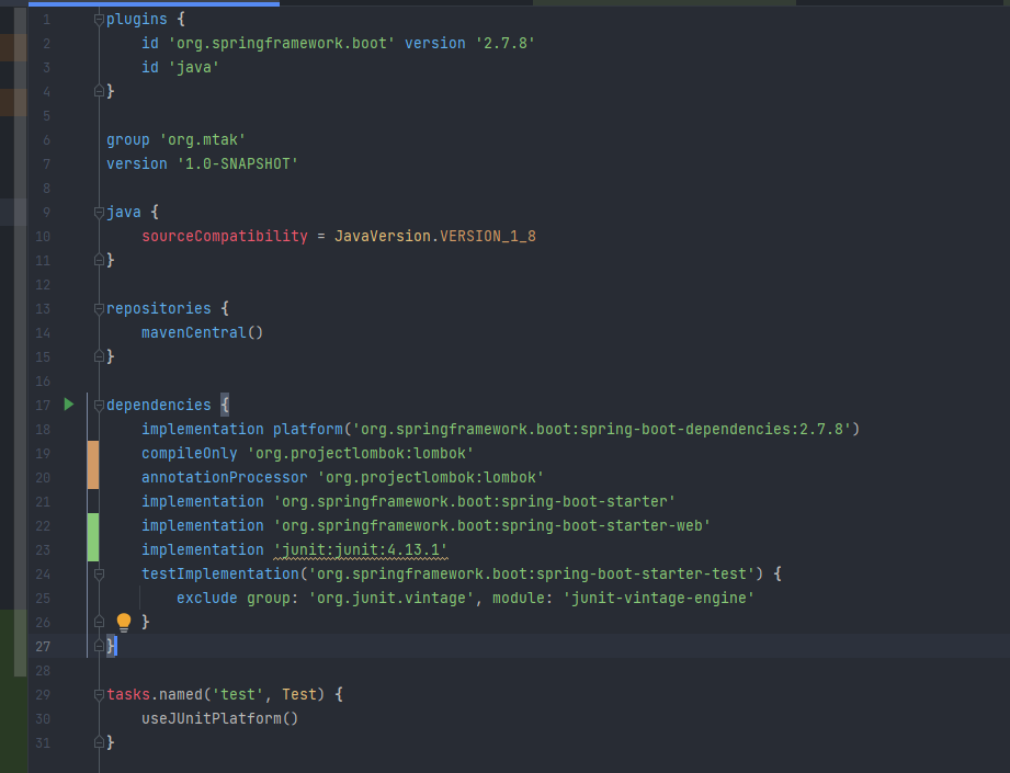 롬복이 제대로 빌드가 되지 않았기 때문에 인텔리제이에서 찐 롬복 클래스를 사용하는 테스트에 대해 초록 화살표를 안띄워 주었던 것이다.