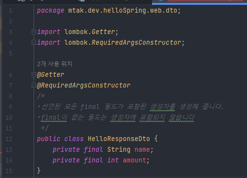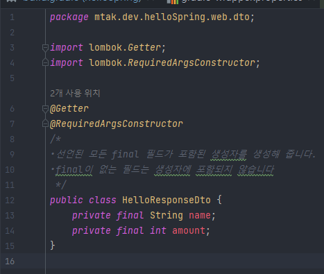 C:\Users\192293\helloSpring\src\main\java\mtak\dev\helloSpring\web\dto\HelloResponseDto.java:9: error: variable name not initialized in the default constructor