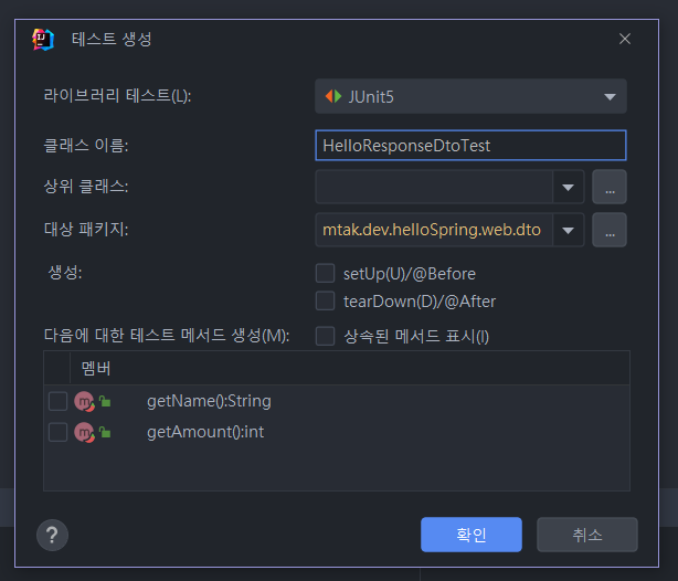 다음에 대한 테스트 메서드 생성 에서 함수를 고르지 않고 테스트 파일을 생성한 경우