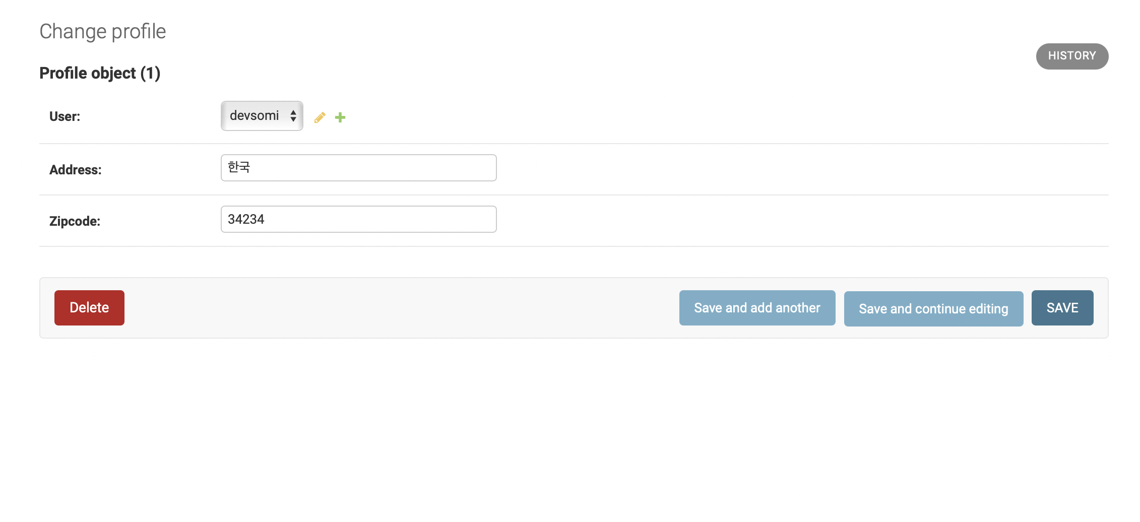 Profile이라는 모델에 user, address, zipcode 네임을 준다.