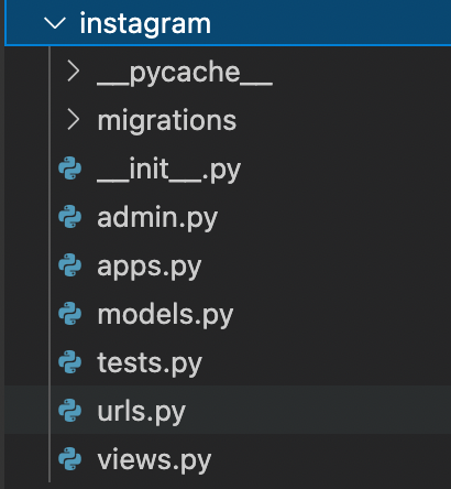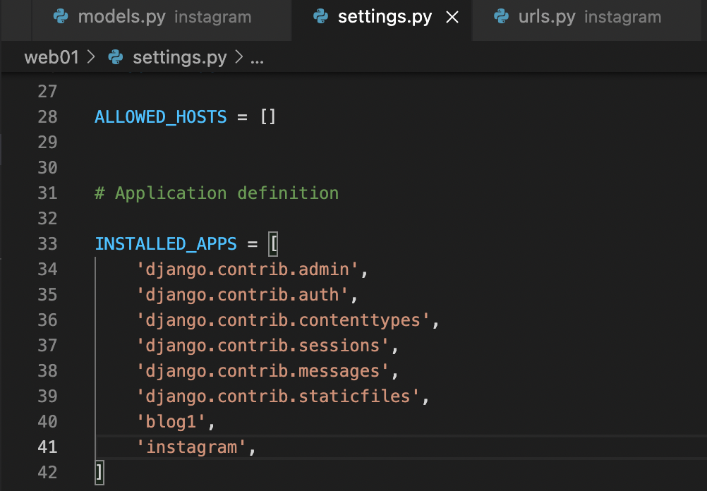 나는 instagram이라는 이름을 가진 앱을 생성했고 INSTALLED_APPS 리스트에 등록을 함