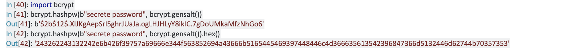 In [42]: bcrypt.hashpw(b"secrete password", bcrypt.gensalt()).hex()