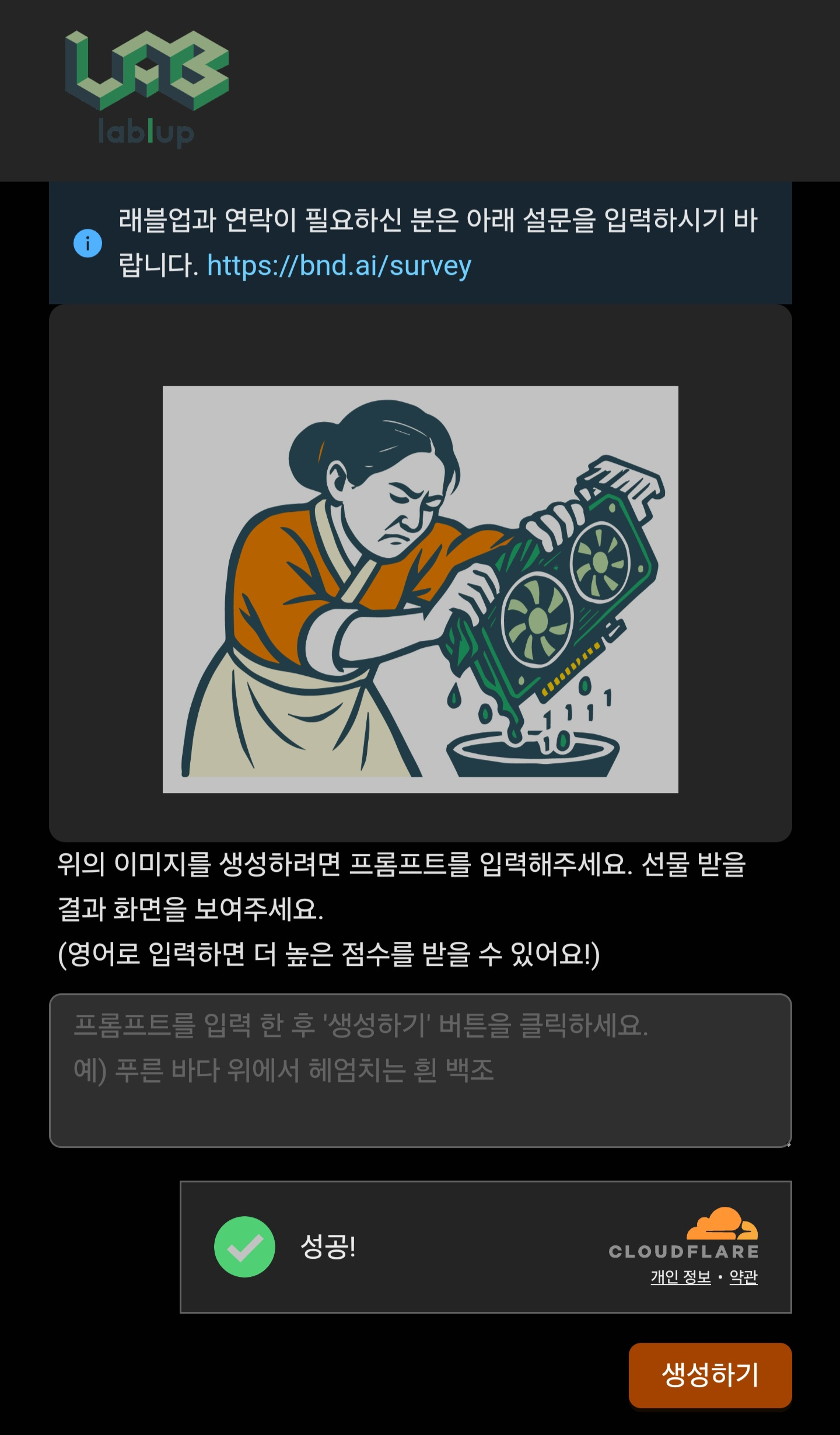 lablup이라는 회사의 부스에서는 해당 이미지와 유사한 이미지를 생성하는 프롬프트를 입력하여, 높은 유사도를 도출해내면 선물을 받는 이벤트를 진행하고 있었다.