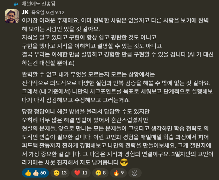 어느 날은 Slack에 학습과 구현의 균형, 그리고 시간 관리, 효율적인 학습 방법에 관련된 질문이 올라왔다. 챌린지 미션을 해본 사람들이라면 대부분 공감할 내용의 질문이었다.