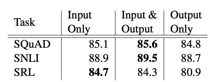 위 실험을 보면 task에 따라 input에만 붙이는 것이 성능이 더 좋은 경우도 있었다.