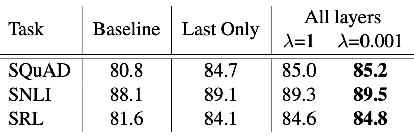 - biLM 계층이 문맥 내 단어들에 대한 다른 유형의 구문 및 의미 정보를 효율적으로 인코딩하고, 모든 계층 사용 시 전반적인 작업 향상을 보였다.