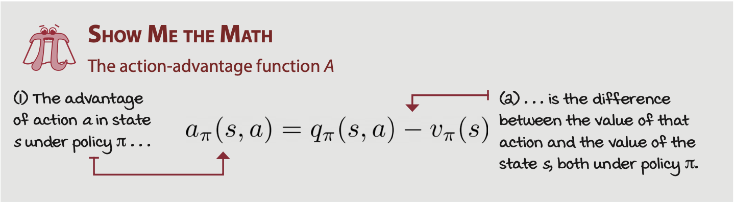 - 현재 상태 s에서 a의 액션을 취했을 때 얻는 기댓값 - 현재 상태에서 모든 액션에 대한 기댓값의 평균