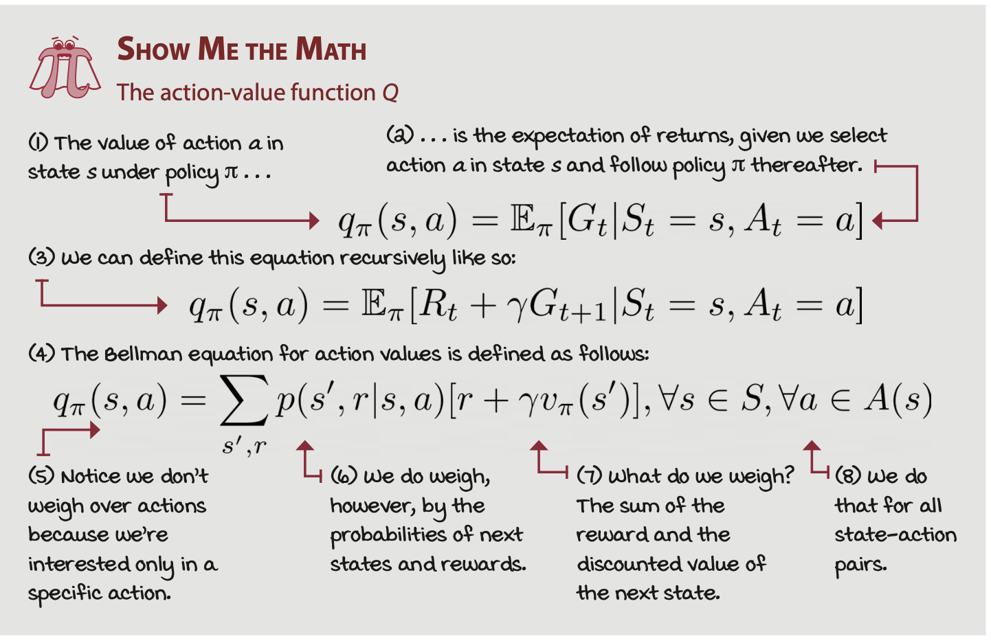 - state s에서 a라는 action을 취했을 때 얻게되는 value(지금 행동으로부터 기대되는 return)